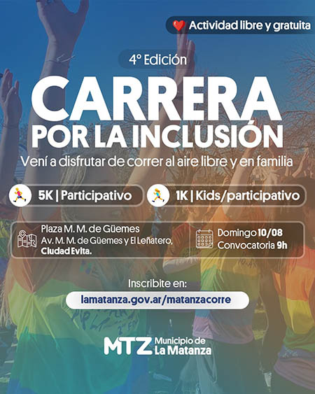 El próximo domingo 10 de agosto a las 9 de la mañana, Ciudad Evita será el punto de encuentro para vecinos y vecinas que quieran disfrutar de una jornada de deporte, salud y encuentro comunitario. Se trata de la 4ta edición de la Carrera por la Inclusión, un evento organizado por el Gobierno de La Matanza, a través de la Secretaría de Deportes y Recreación.