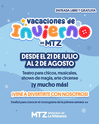 Del 21 de julio al 2 de agosto, el Gobierno Municipal de La Matanza ofrece una nutrida agenda cultural y recreativa pensada para que niñas, niños y sus familias vivan el receso escolar de invierno con propuestas gratuitas, diversas y accesibles en todo el distrito.