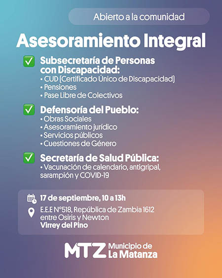 El Municipio de La Matanza organiza una jornada gratuita con asesoramiento sobre CUD, pensiones, pase libre y vacunación, destinada a personas con discapacidad.