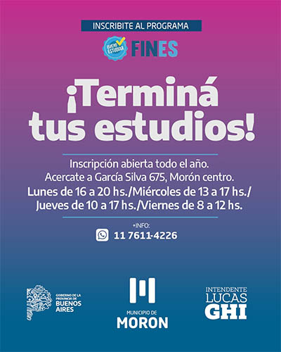 El Municipio de Morón mantiene abierta la inscripción al Plan FinEs, un programa educativo que permite a personas mayores de 18 años iniciar o finalizar sus estudios primarios y secundarios. La propuesta está dirigida especialmente a quienes no hayan completado sus trayectorias educativas o adeuden materias del último año del nivel secundario.