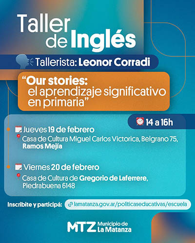 Los talleres de inglés, a cargo de la especialista Leonor Corradi, se centran en narrativas y estrategias didácticas para un aprendizaje significativo en la primaria. El cronograma incluye: